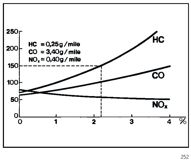 If the engine now runs too lean (e.g. through a 10 % addition of false air) in this operating condition, the FR value (oxygen sensor) will deviate from its mean value by this value (by 1.10), to compensate for the false air. Despite the 10 % false air, the mixture is now once more in the lambda = 1 range and the oxygen sensor is working at around 1.11.