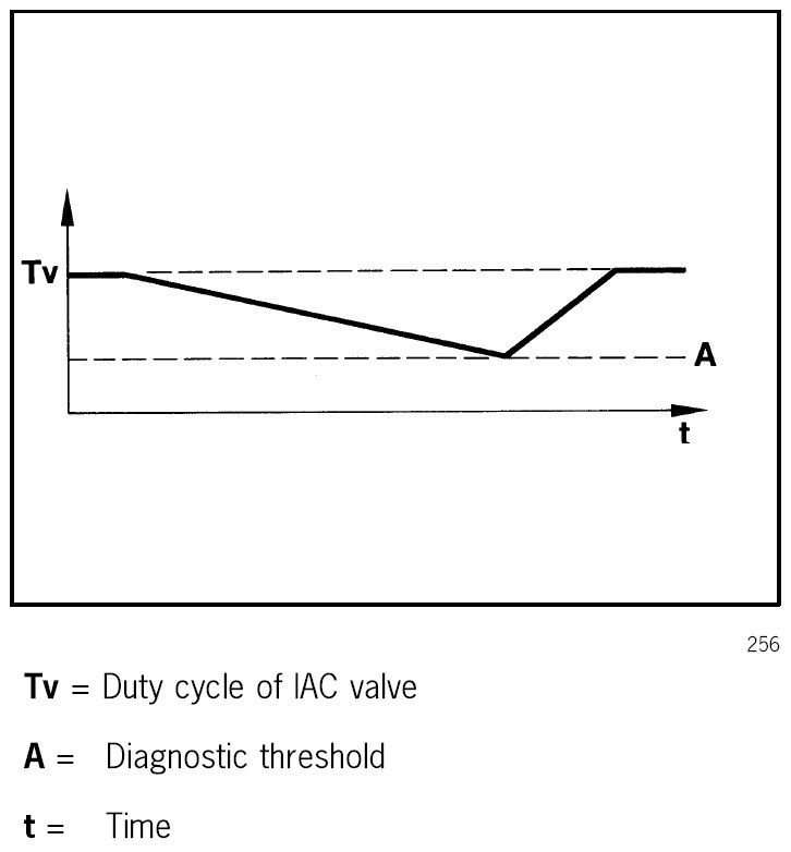 Should the additional fuel/air mixture from the EVAP canister purge valve (fuel vapours and fresh air) be exactly at the ratio of lambda=1, the duty cycle of the IAC valve is reduced. When the diagnostic threshold is reached, here, too, diagnosis is successfully completed.