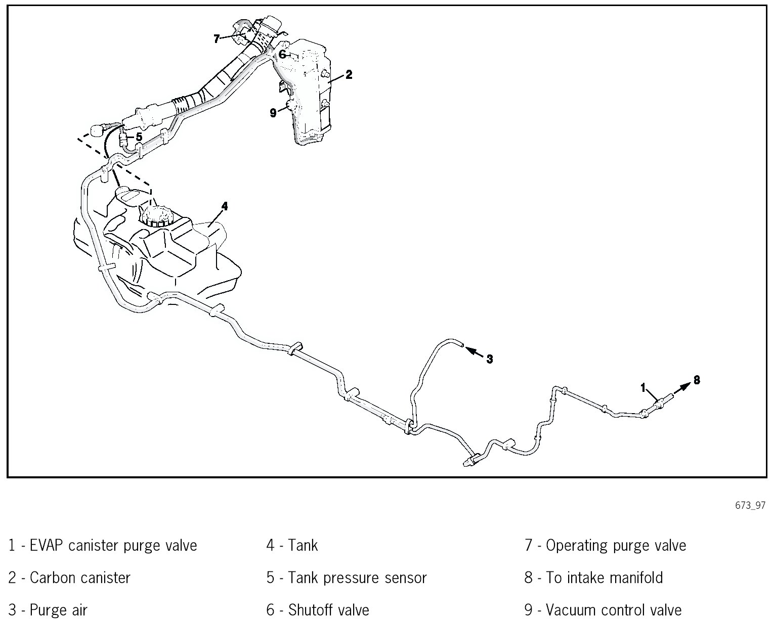 - The EVAP canister purge valve (1) and shutoff valve (6) are closed. The increase in pressure is measured by the tank pressure sensor (5).