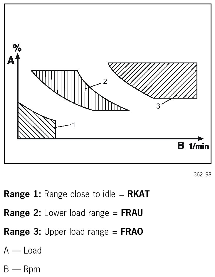 Adaptation can take place in three load and eight speed ranges, i.e. in a total of 24 different ranges. Adaptation is performed in both fuel off and fuel on modes.