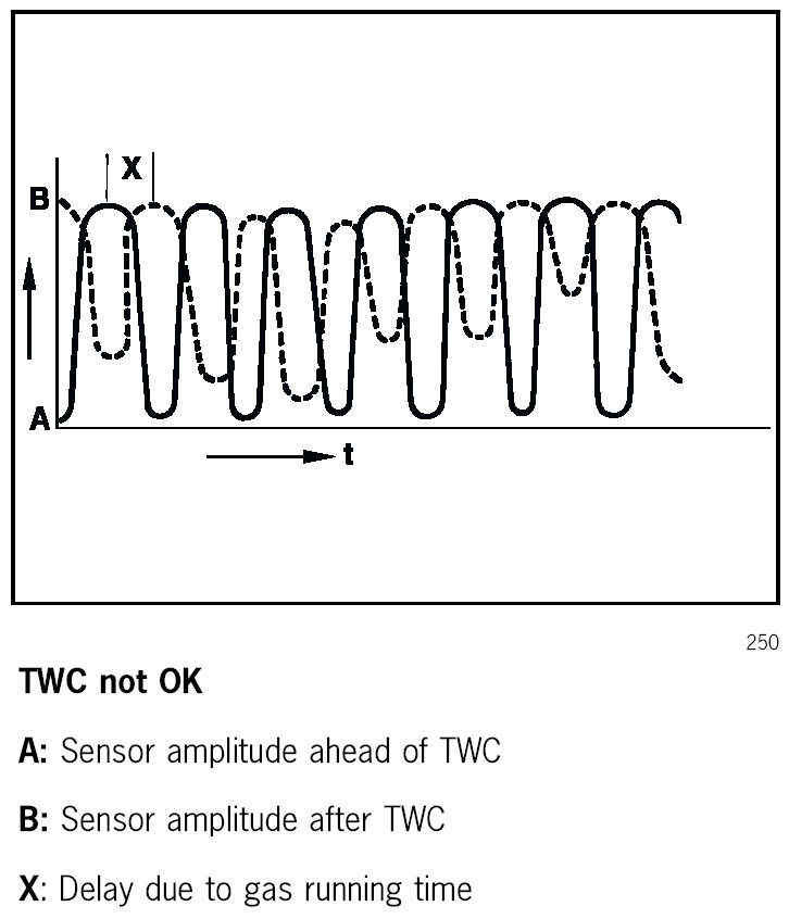 While the secondary air injection is active, the diagnosis of the system is performed. The additional air behind the exhaust valves leads to a surplus of oxygen in the oxygen sensors and therefore to a voltage reduction in oxygen sensors ahead of the TWC.