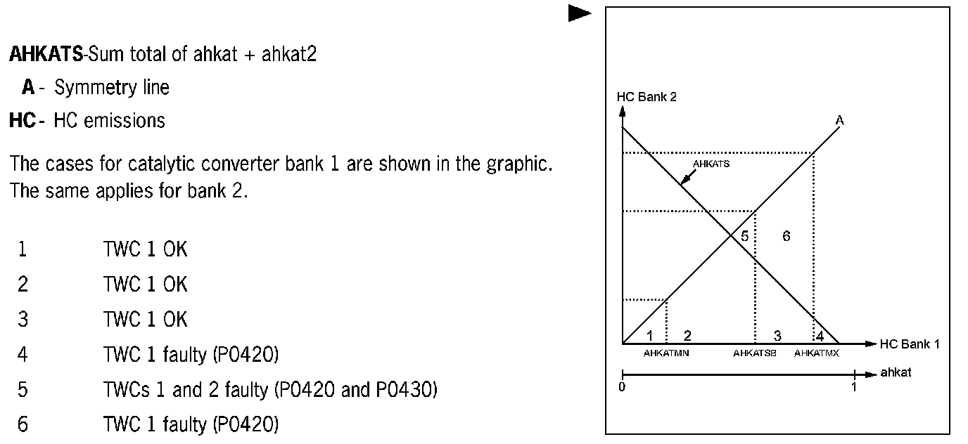 The catalytic converters (bank 1/bank 2) are monitored individually and for the sum of the emissions. There are two threshold values for individual monitoring: