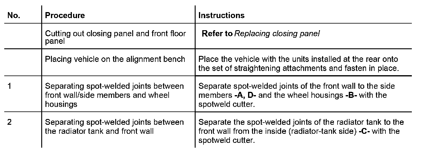 - All straightening work on the body in this area must have been completed before the damaged parts are removed.