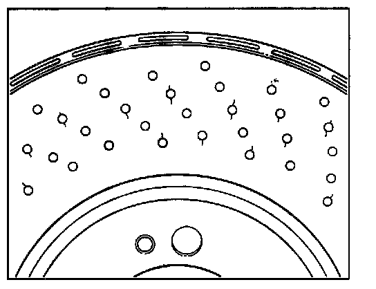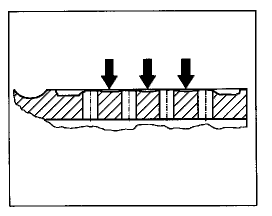 - In the presence of high pressure forces, at the innermost and outermost hole-free friction plate track -arrows-, the brake pad friction surface is the least worn, compared to the middle holed area. As a result, in the case of weaker braking, a relatively higher amount of pressing on the surface arises in these areas and therefore greater wear of the friction plates. The natural balance between stronger and weaker braking ensures that in almost all cases the typical wear profile of a perforated friction plate arises (inner and outer smooth friction rim area) is the most worn -arrows-.
