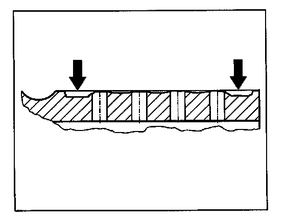 The drawing shows the typical grooved wear profile -3 arrows- of a perforated grey cast iron brake disc, which has been used to the wear limit, under tough conditions i.e. constant operation mode (test operation mode).