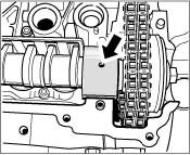 7. Insert exhaust camshaft 1-3. Lay the control chain on the flange for the chain sprocket, then insert the camshaft at overlapping TDC of cylinder 1 (the cams of cylinder 1 point diagonally downwards towards the outside of the cylinder head -arrows- ).