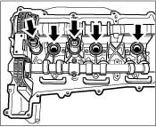 7. Insert exhaust camshaft 4-6. Lay the control chain on the flange for the chain sprocket, then insert the camshaft at overlapping TDC of cylinder 4 (the cams of cylinder 4 point towards the cams of the inlet camshaft -arrows- ).