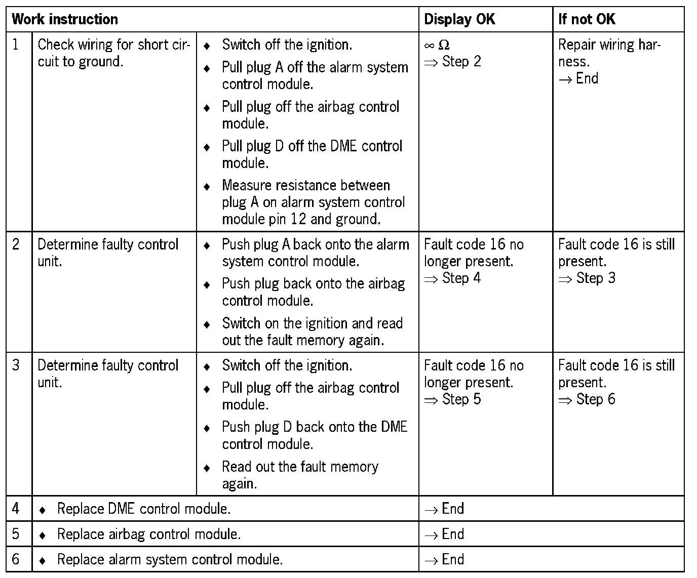 - Short circuit to ground in wiring between the alarm system control module and the airbag and DME control modules