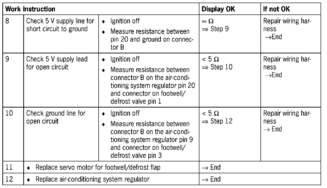 - Short circuit to B+/ground/between one another or open circuit in the wiring between the air-conditioning system regulator and the footwell/defrost valve.