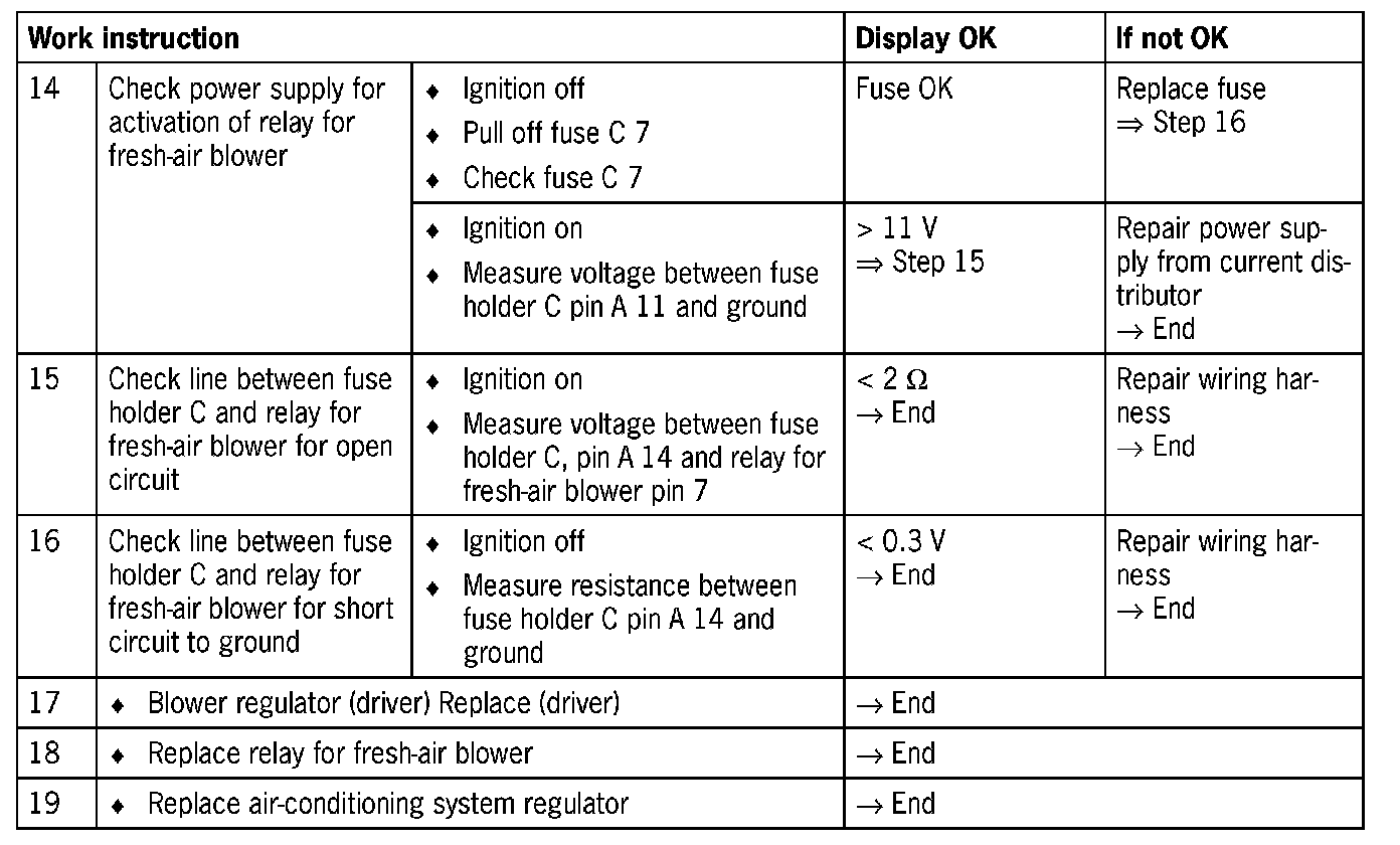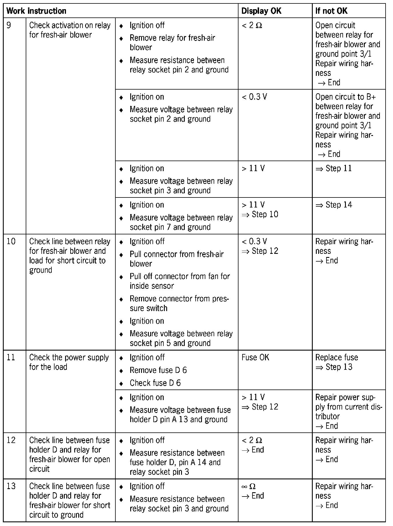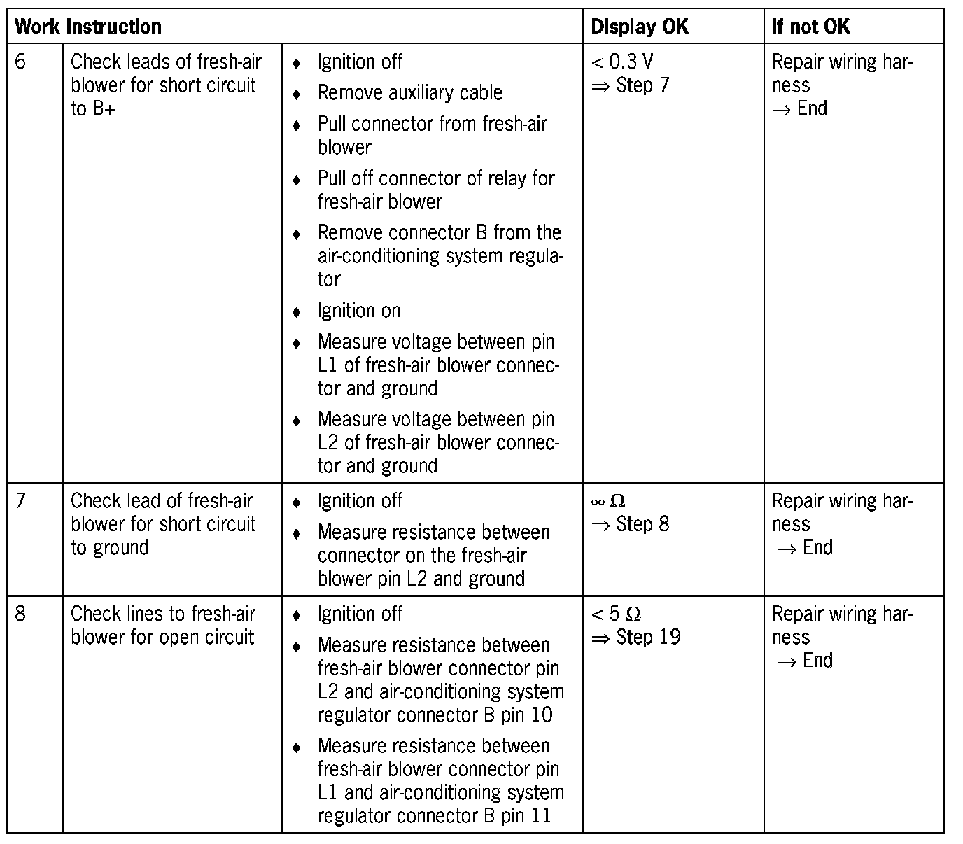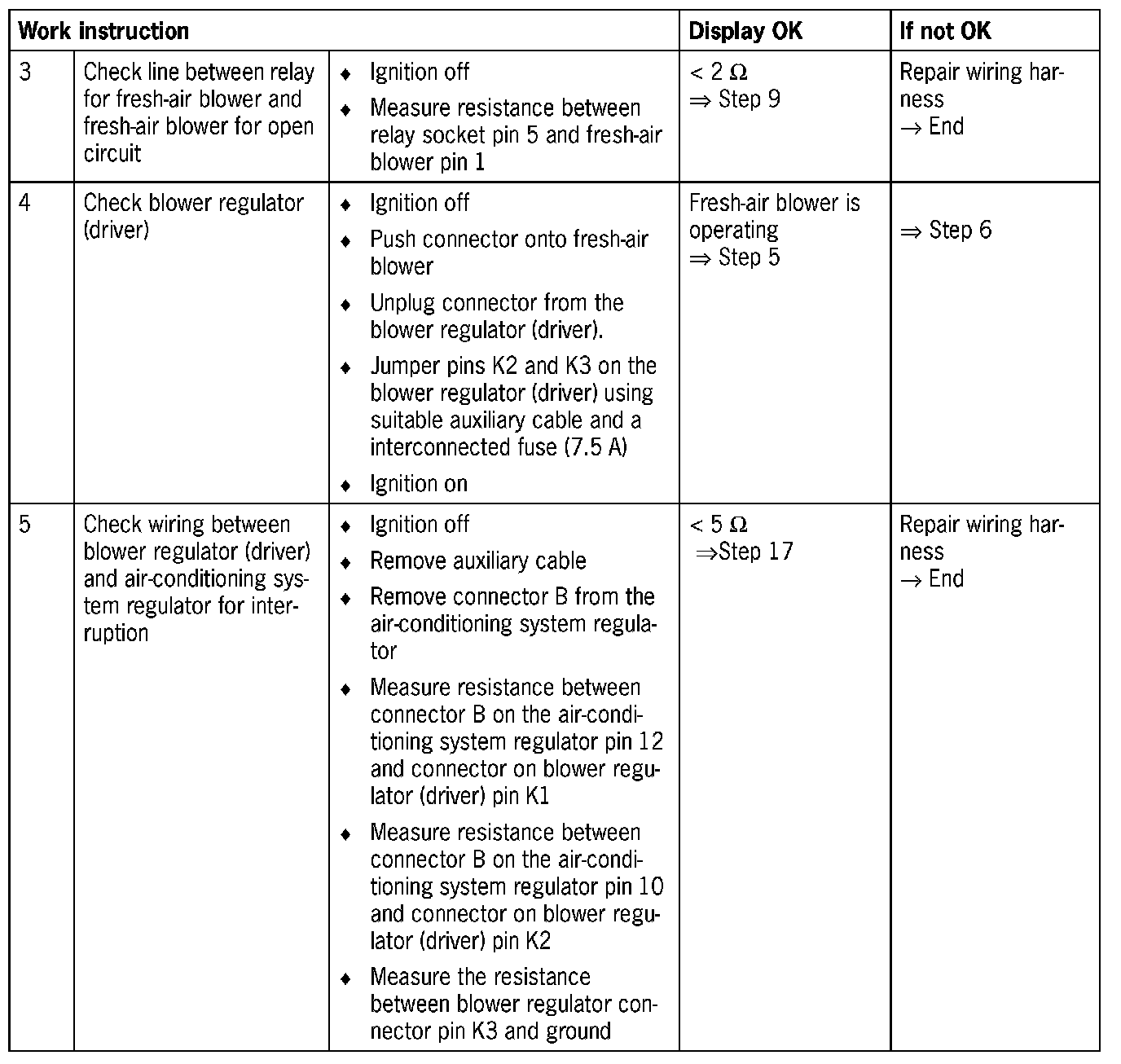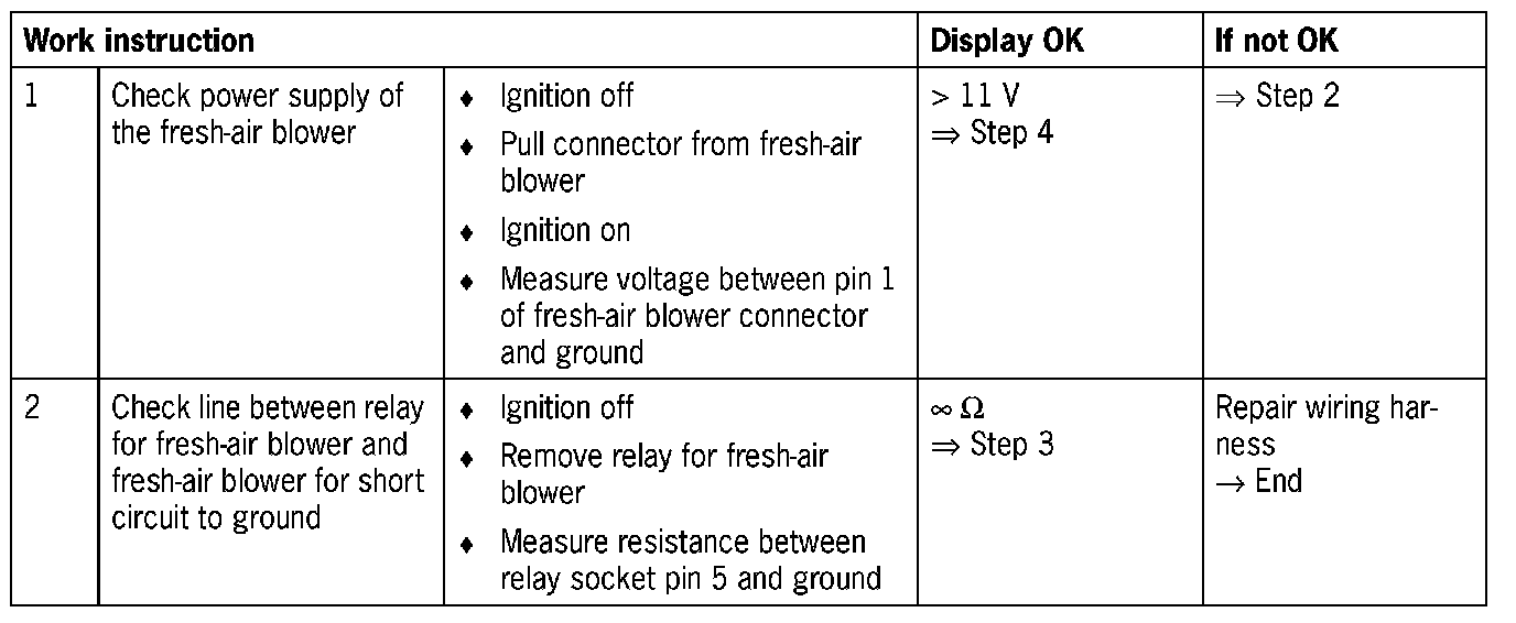 - Fault in the lines between relay for fresh-air blower or blower regulator (end setting) and fresh-air blower.
