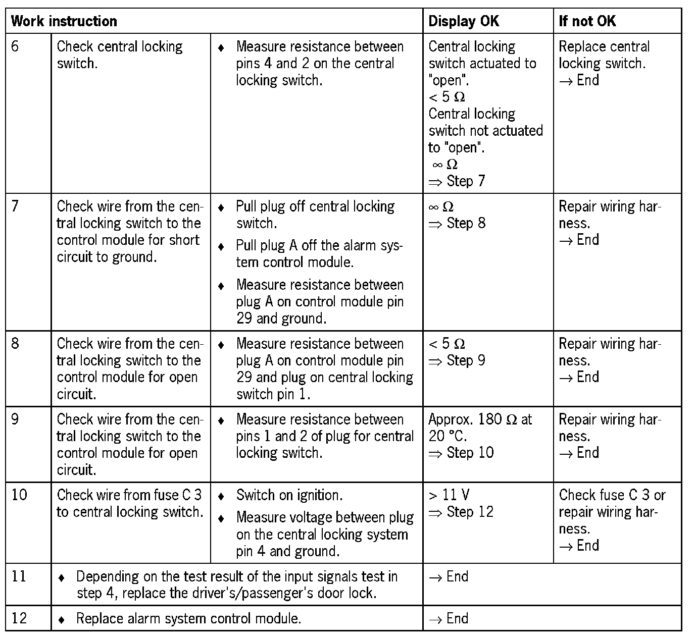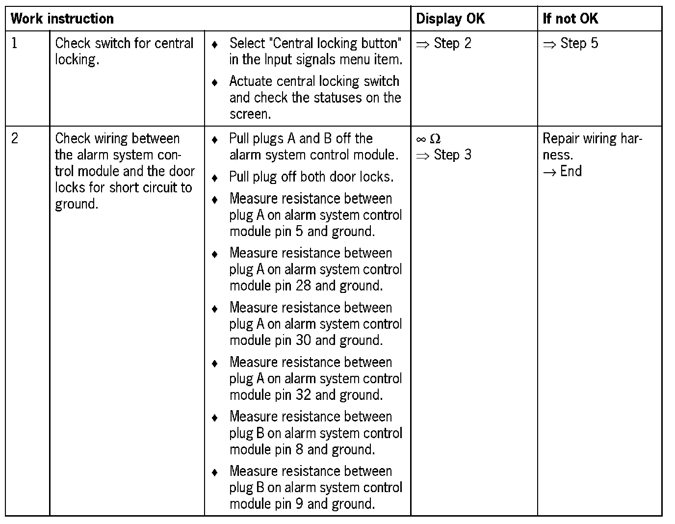 - Short circuit to ground/open circuit in wiring between the alarm system control module, central locking switch or door locks