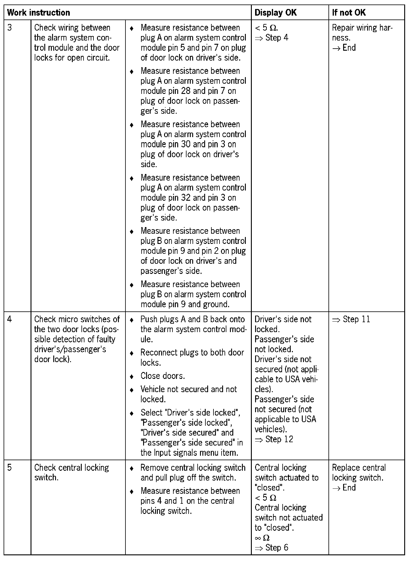 NOTE: During troubleshooting, the micro switches of the door locks are tested in Step 4. The test is to be used only for vehicles with "Safe position". USA vehicles do not have a "Safe" position; "Driver's door secured" and "Passenger's door secured" are therefore displayed during the "Input signals" test.