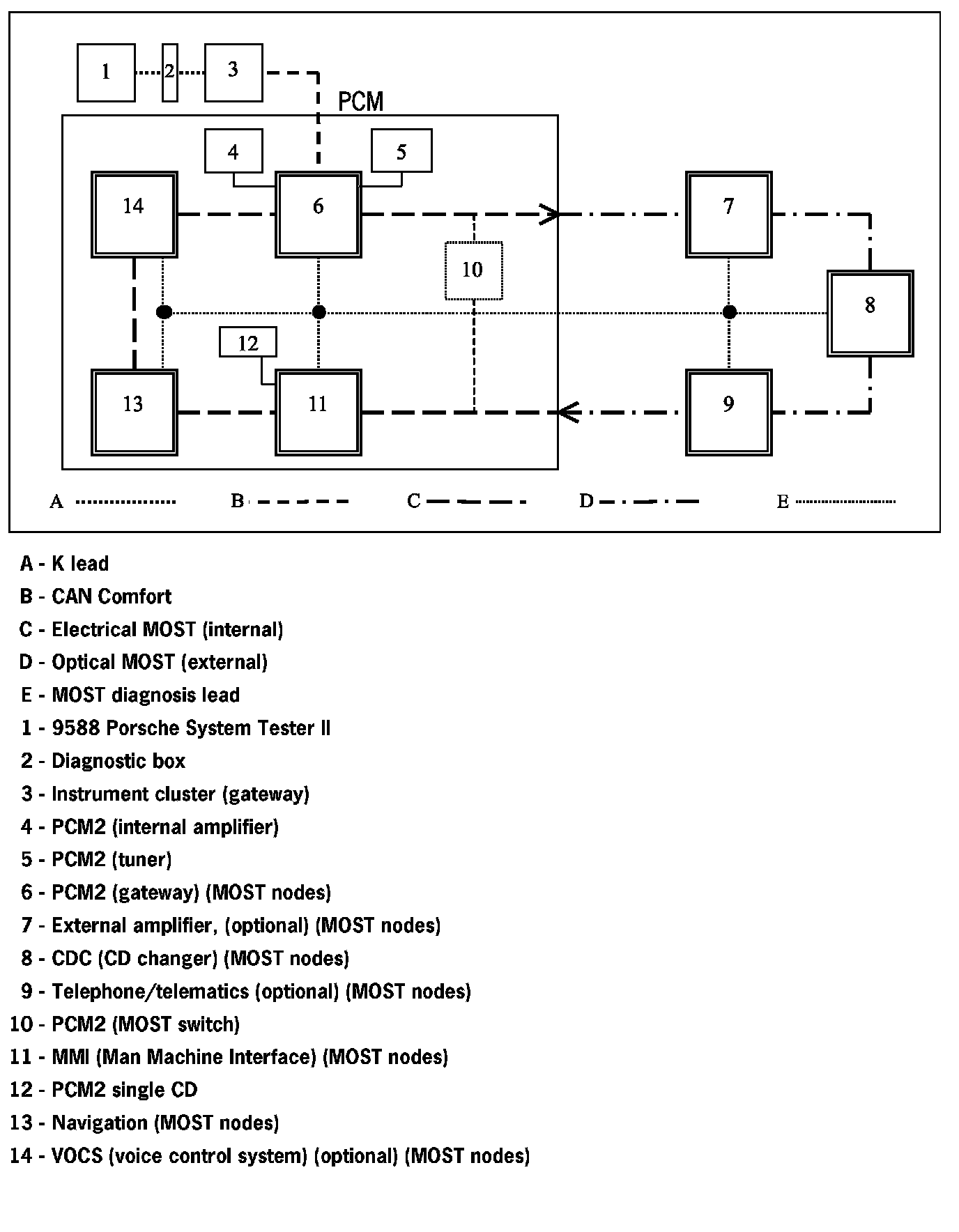 - The diagnosis distribution line and the MOST optical waveguide are connected to the following control modules: