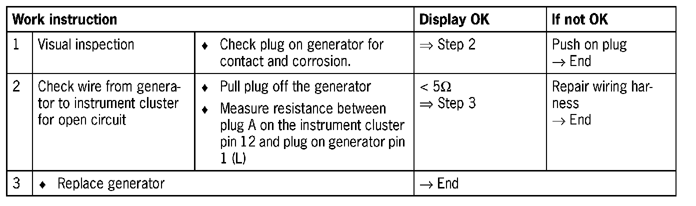 - Open circuit in the wire between instrument cluster and generator (pin 61)