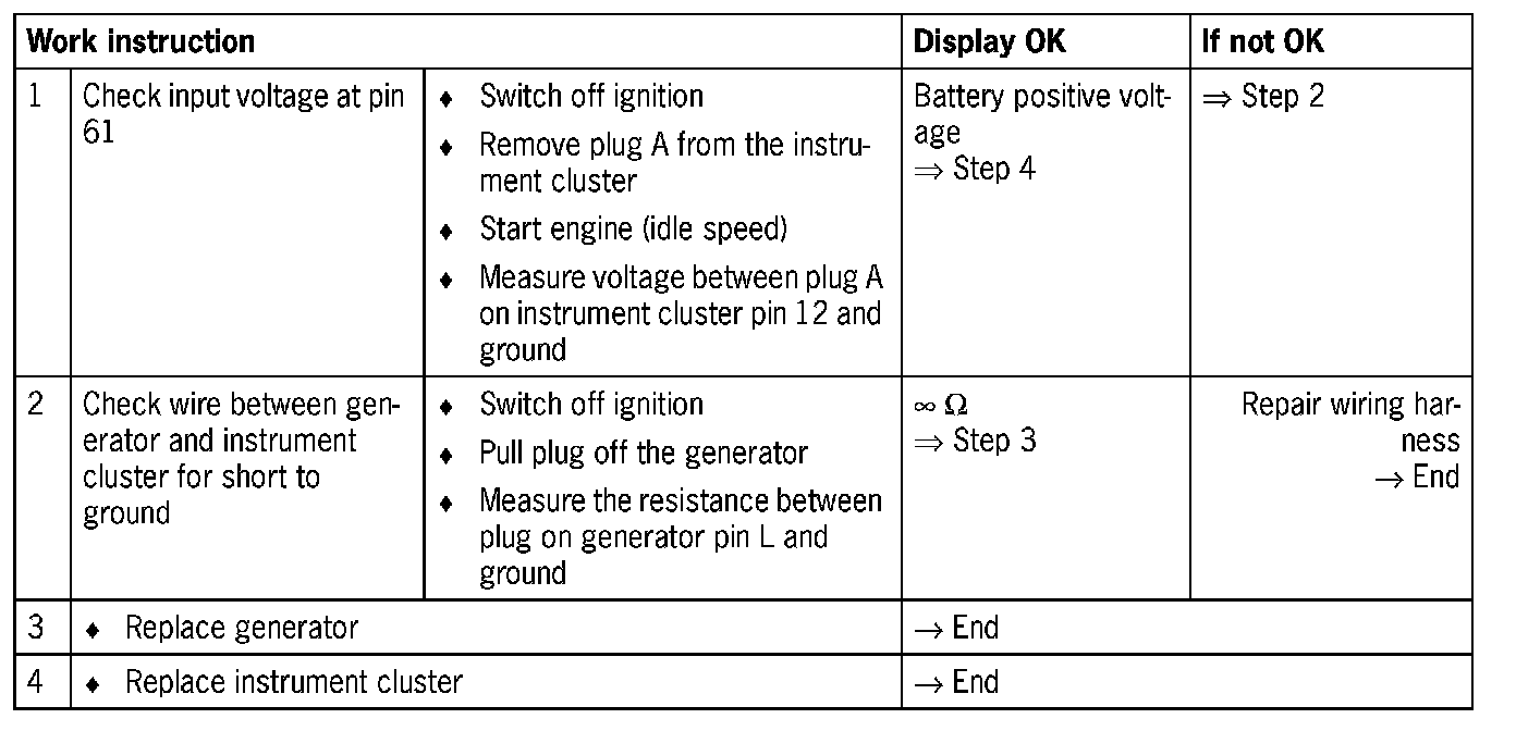- Short circuit to ground in the wire between instrument cluster and generator (pin 61)