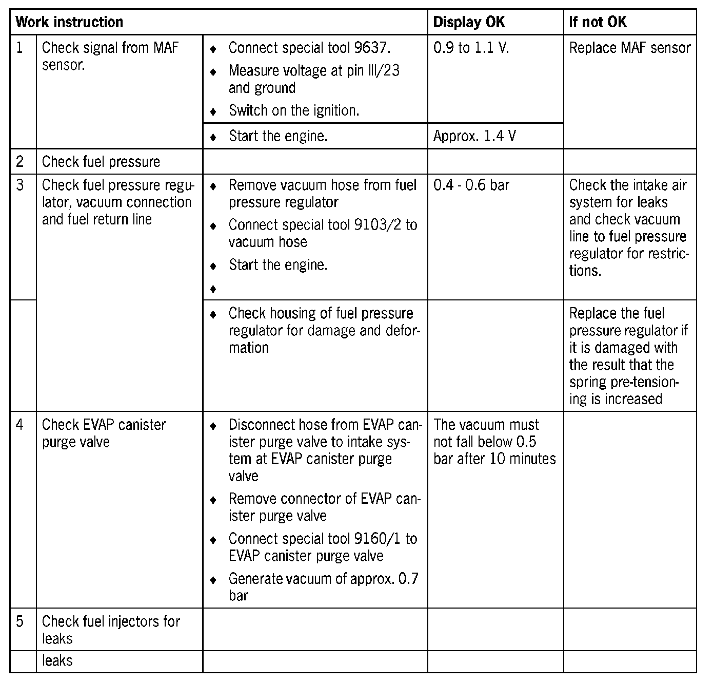 - If DTC P0445 (fuel tank vent valve - short to ground) is stored, correct this fault first. An open EVAP canister purge valve can lead to the lean threshold being reached.