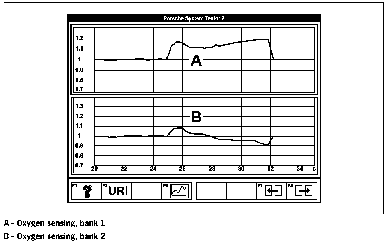A faulty flat-base tappet can be detected because the oxygen sensor FR for this cylinder bank hardly changes the mixture at all given acceleration with wide-open throttle (FR at 1) and enriches the mixture in the opposite cylinder bank (FR > 1) --> see drawing below. Given a difference between FR1 and FR2 of more than 8 % during acceleration with wide-open throttle, a fault is certainly present.