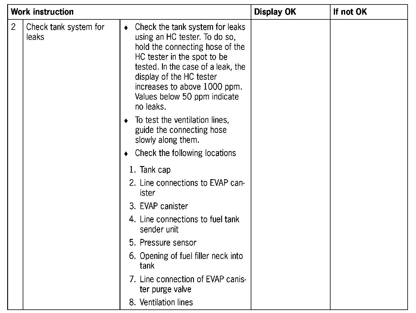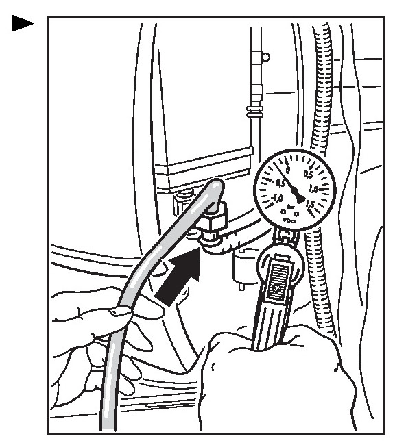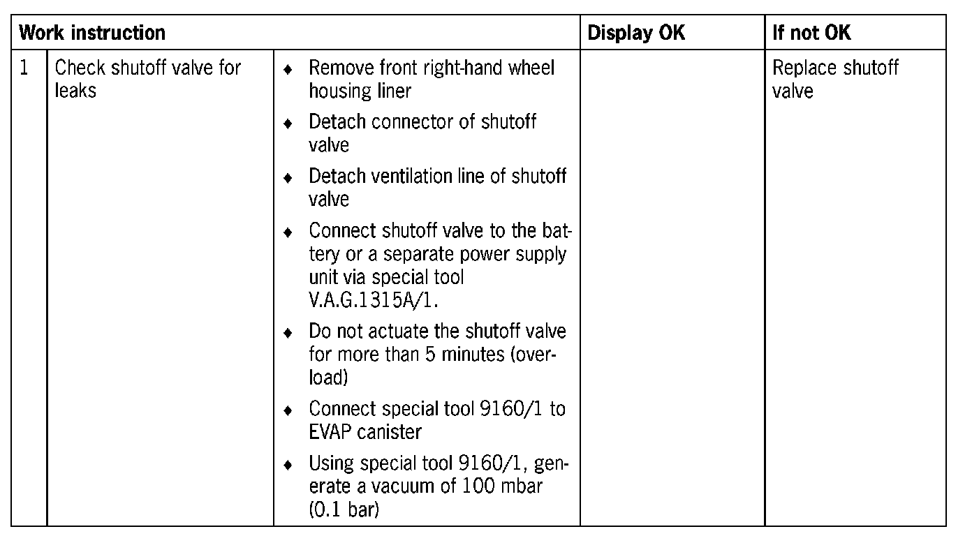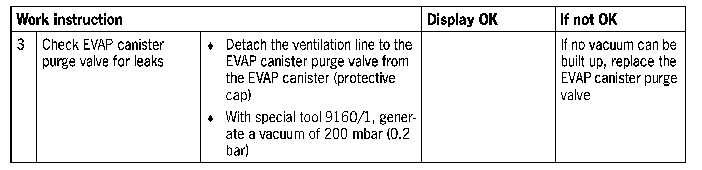 - If no leaks are found, a gauge pressure of max. 100 mbar (0.1 bar) can be generated at the EVAP canister at the connection to the tank using special tool 9160/1, in order to increase the escape of fuel vapours.