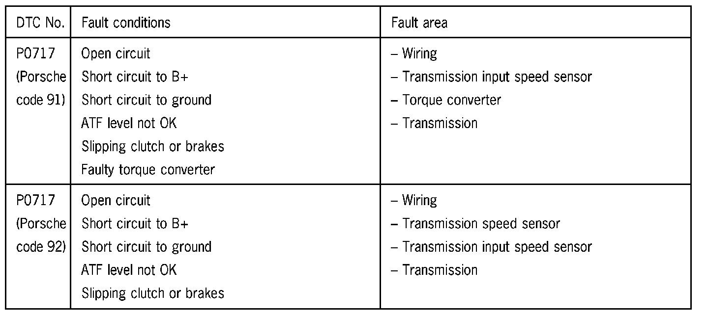 P0717 (Porsche codes 91 and 92)Stall speed, transmission input - signal implausible
