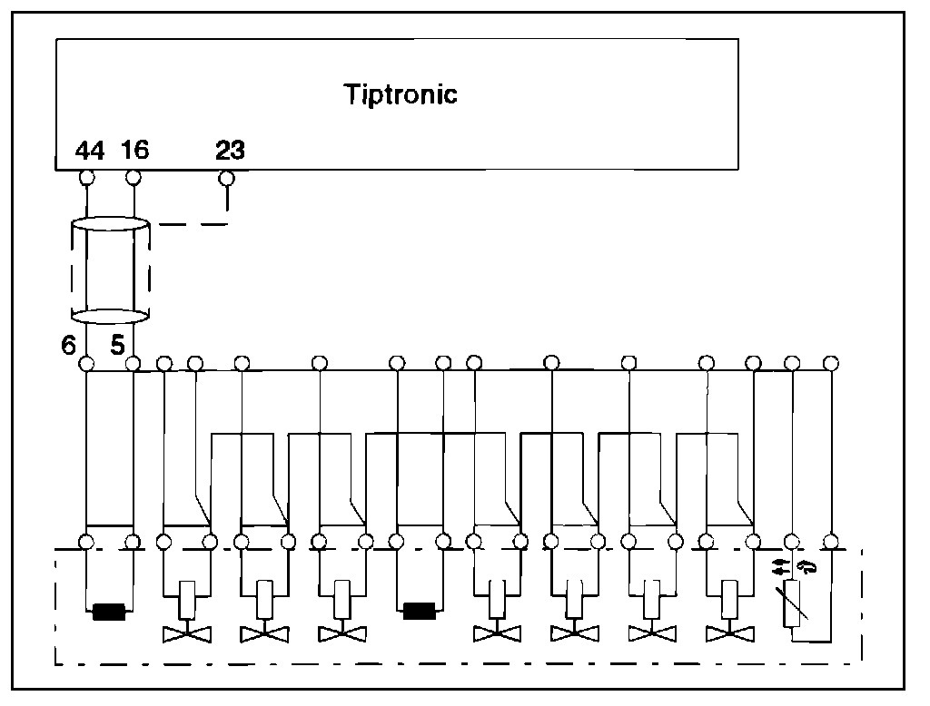 2. Connect ohmmeter to Tiptronic control module connector pin 16 and pin 44.