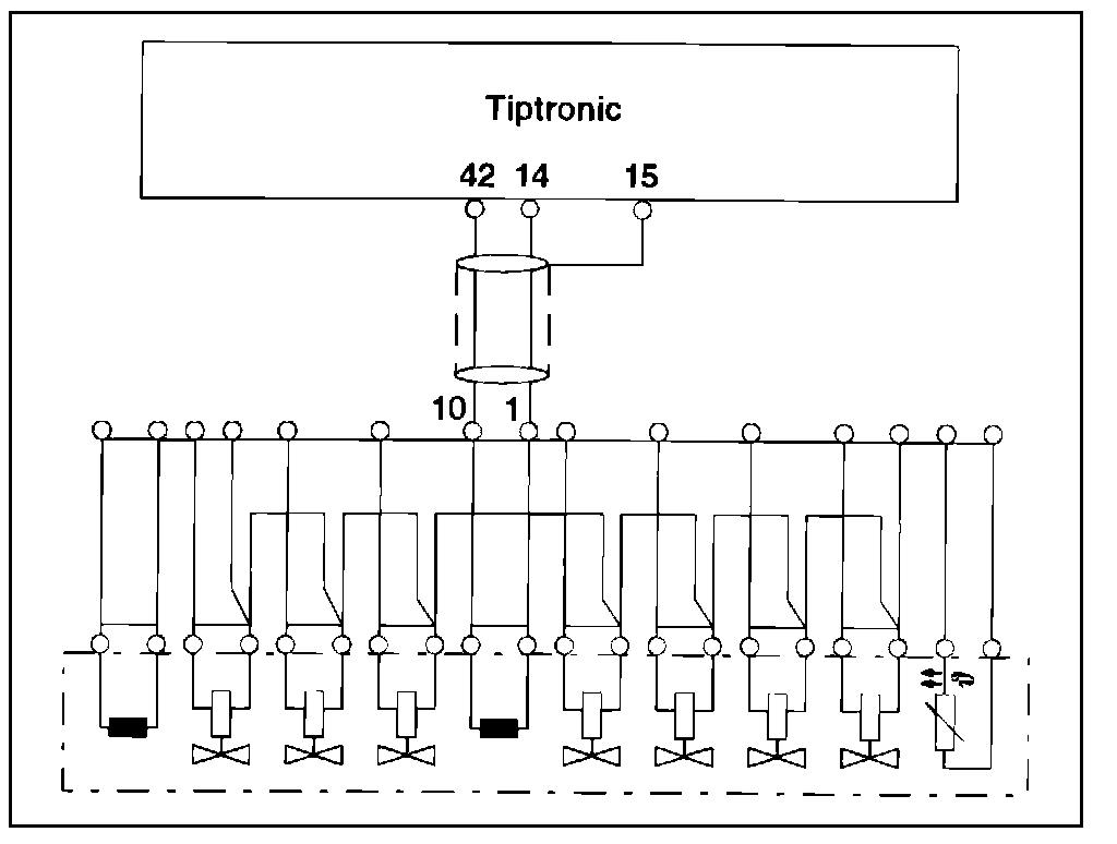 2. Connect ohmmeter to Tiptronic control module connector pin 14 and pin 42.
