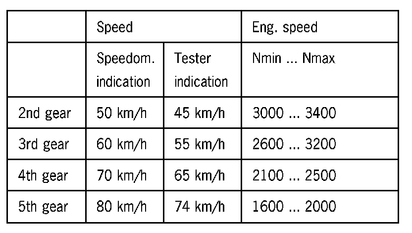 - On level ground (not on the roller test stand), drive with a constant vehicle speed or transmission output speed and read off the engine speed. The following values must be achieved: