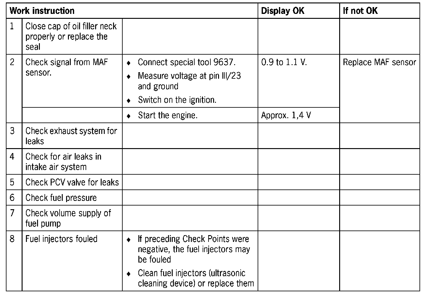 - Air leaks ahead of the oxygen sensors can lead to a fault in adaptation --> Check exhaust system for leaks.