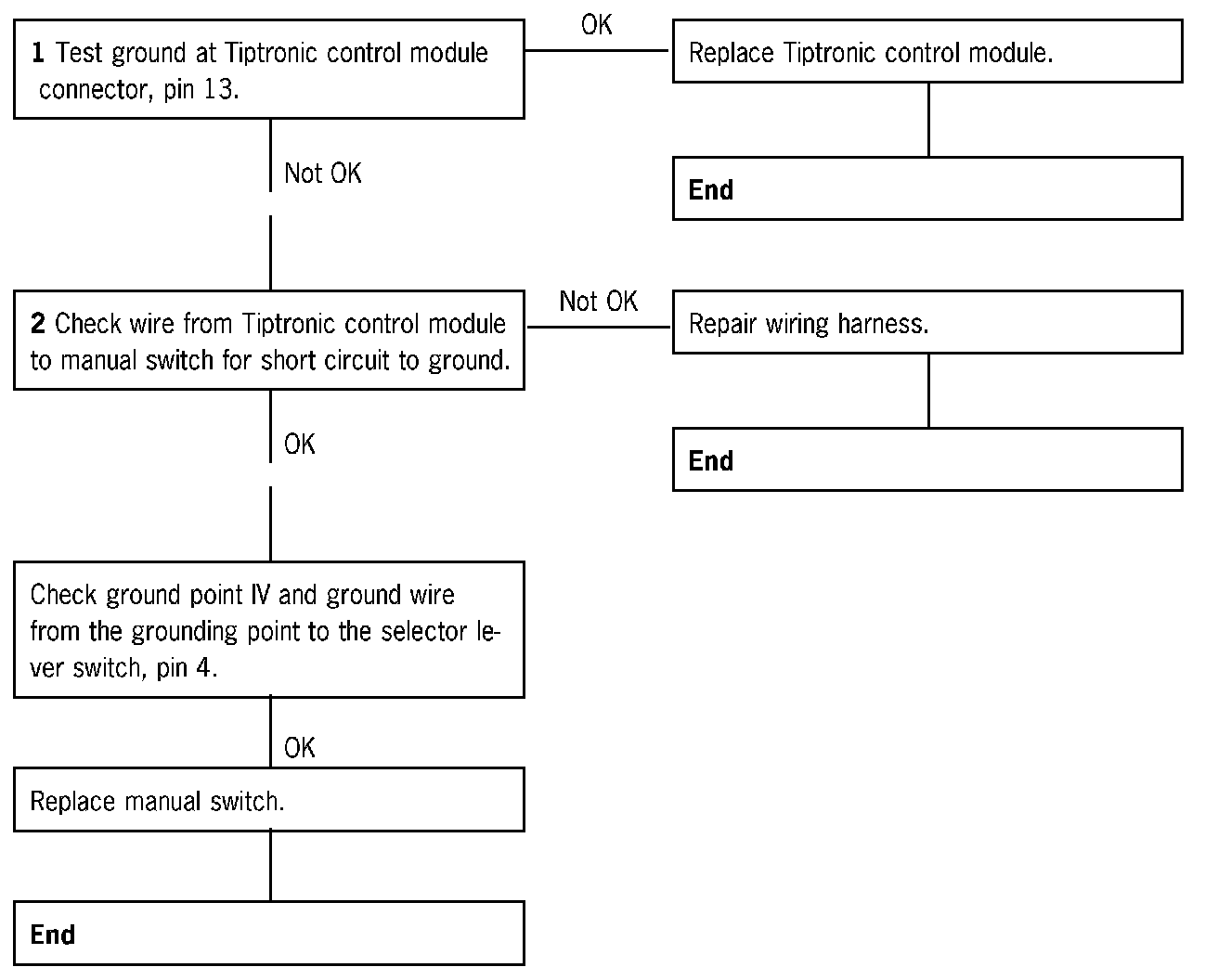 2 Check wire from the Tiptronic control module to the manual switch for short circuit to ground.