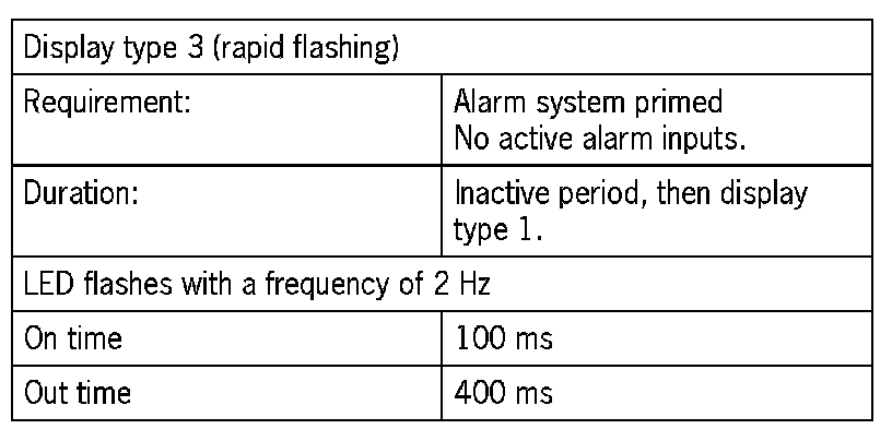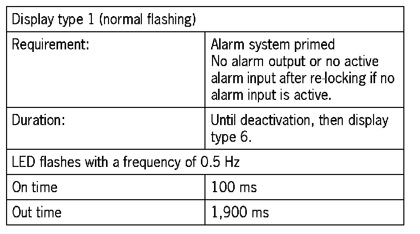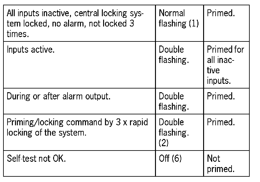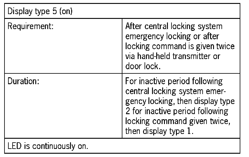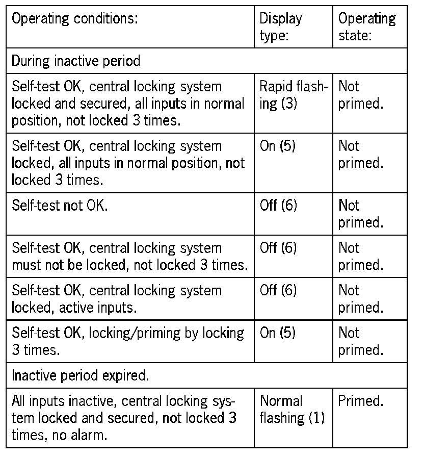 Function display and audible checkbackThe operating state of the central locking system is fed back via the output 'Door locked' and by corresponding activation of the interior light (signals 1 to 3). The operating state of the alarm system is also indicated during the inactive period by the alarm readiness display (display types 1 to 6). It is indicated exclusively by the alarm readiness display after the inactive period has expired. Displayed system faults are always current faults. Previous system faults entered in the status memory have no effect on the function display.