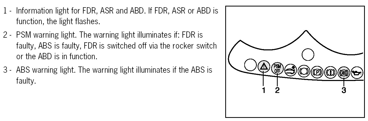 The driver is informed of the PSM control activities by means of the display lights in the instrument cluster. The display lights illuminate for a lamp check when the ignition is switched on. The information and warning lights are triggered via the CAN bus as of model year 2002.