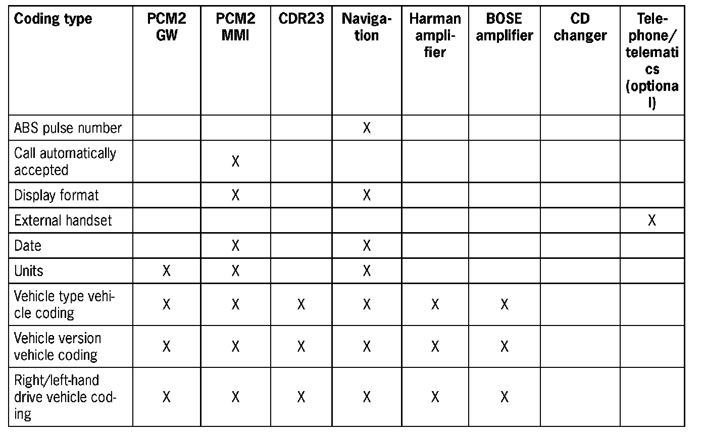 - When the PCM2 is replaced, the coding must be performed in accordance with the connected MOST control modules.