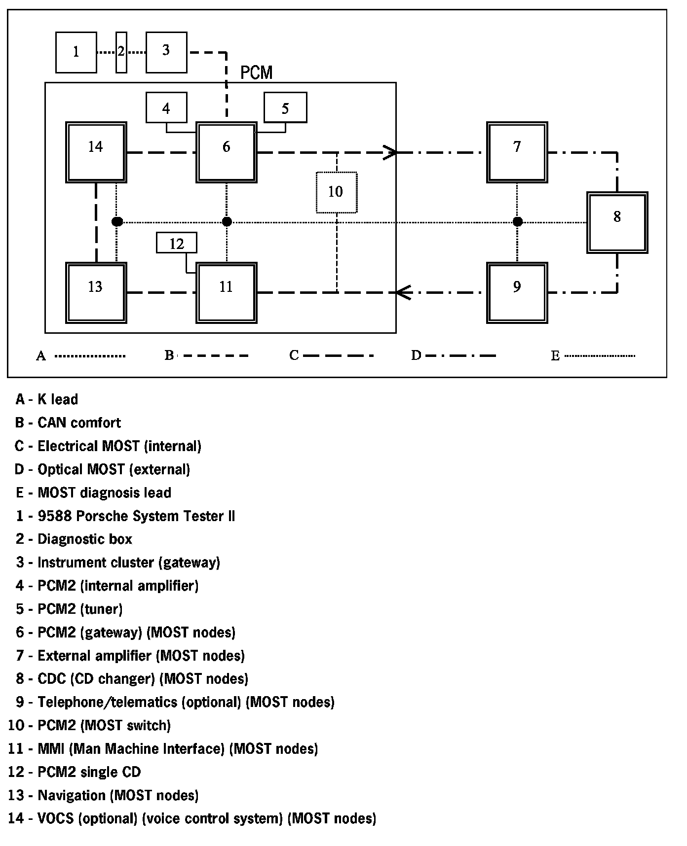 The PCM2 consists of at least two but a maximum of four MOST nodes, (Gateway, MMI and optional Navigation and VOCS (optional)), which communicate with each other via the electronic MOST. Data is transferred outside of the PCM2 via the optical MOST.