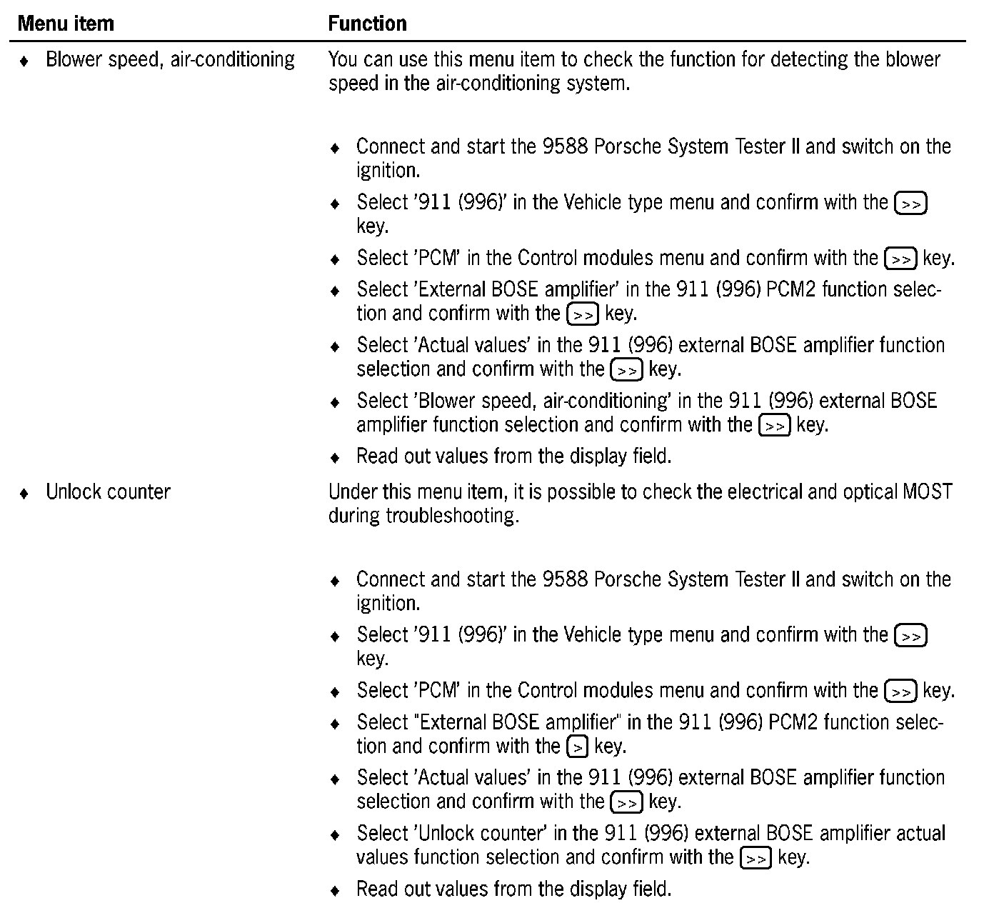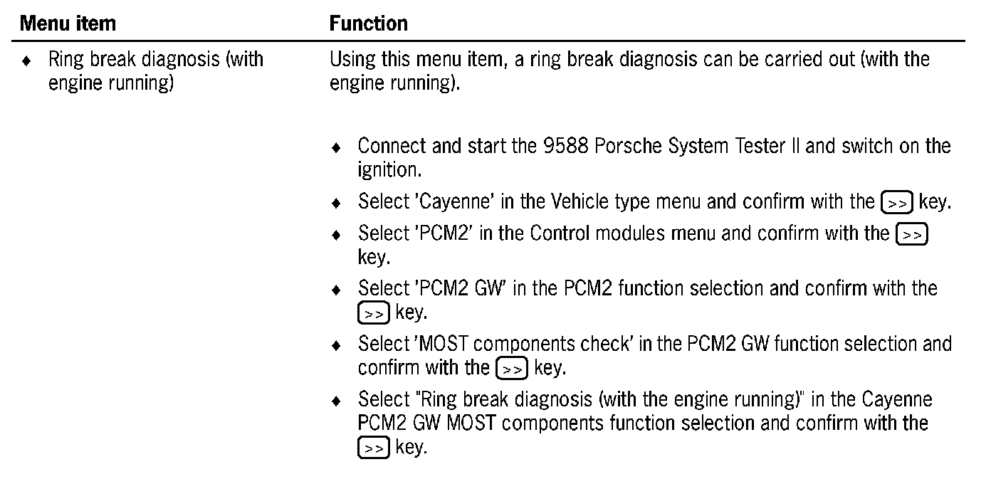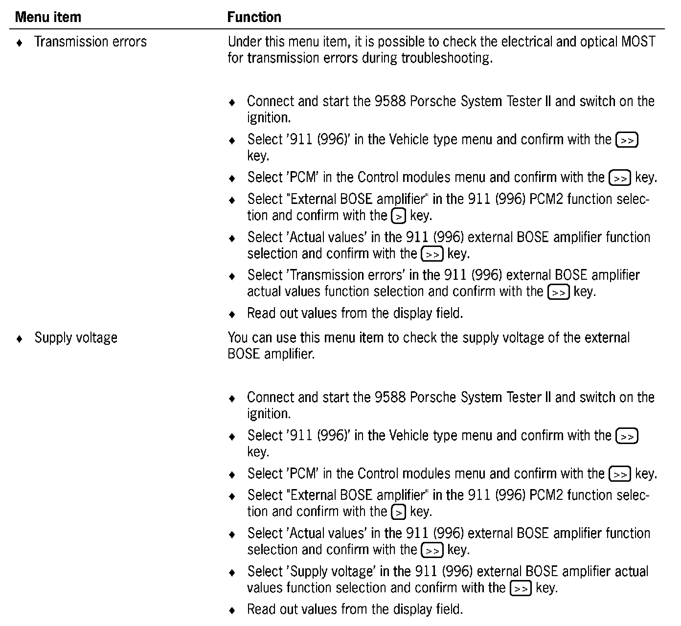 Communication between the 9588 Porsche System Tester II and the MOST control modules only takes place via the K lead to the instrument cluster. The data is transferred from the instrument cluster gateway to the MOST control modules, via CAN Comfort to the PCM2 gateway, via the electrical MOST in the PCM2 and via the optical MOST outside of the PCM2.