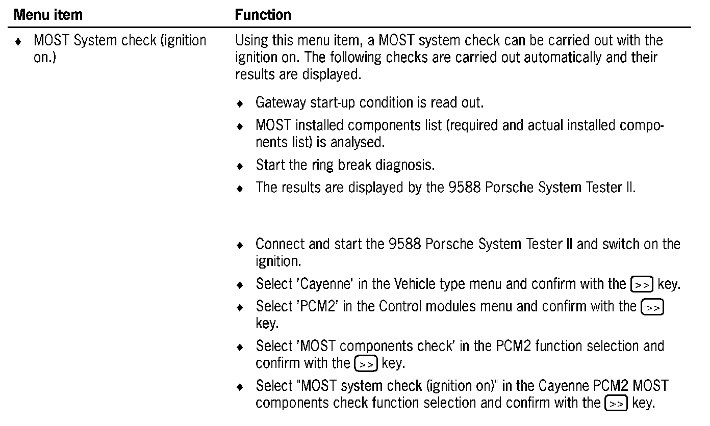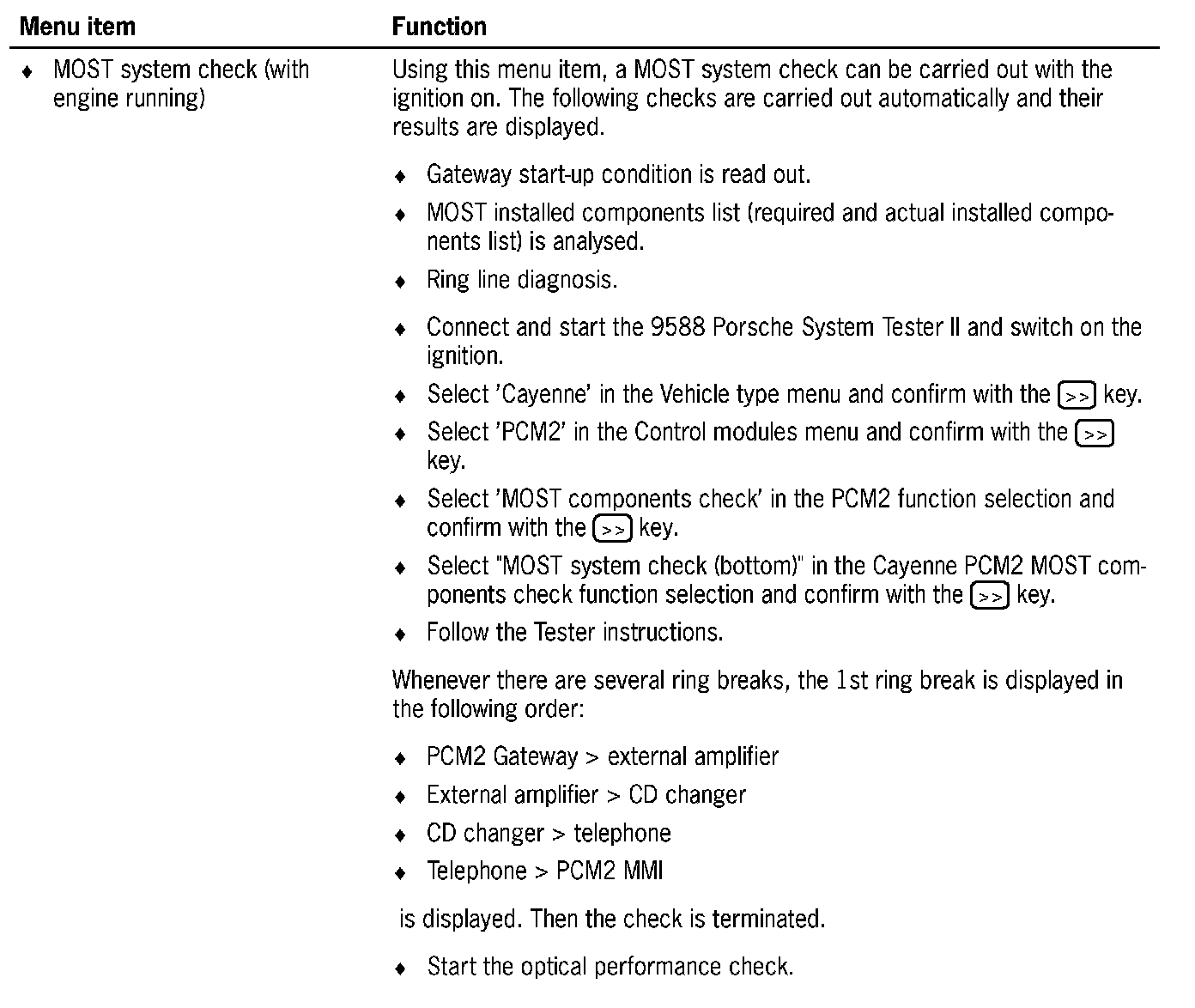 The MOST component check can be reached via the menu PCM2 function selection. This comprises a summary of the following check processes: