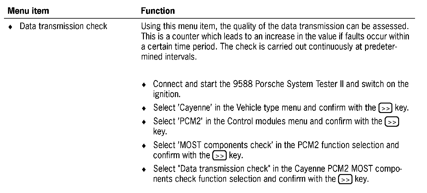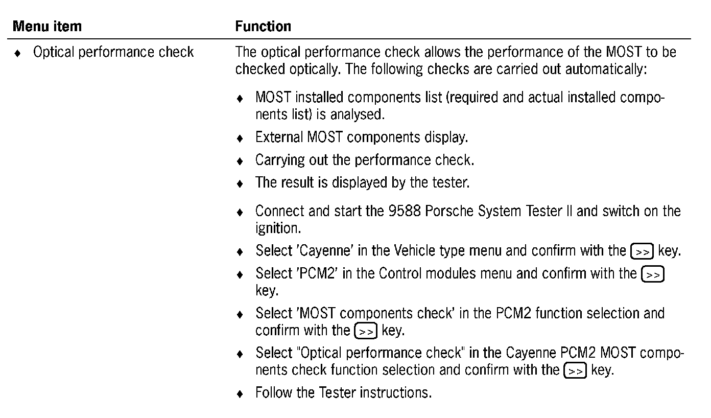NOTE: When there is a customer complaint or identifiable problems but no fault code entries, firstly the 'MOST component check' is to be selected in the PCM2 function selection menu and then the MOST system check is to be carried out.