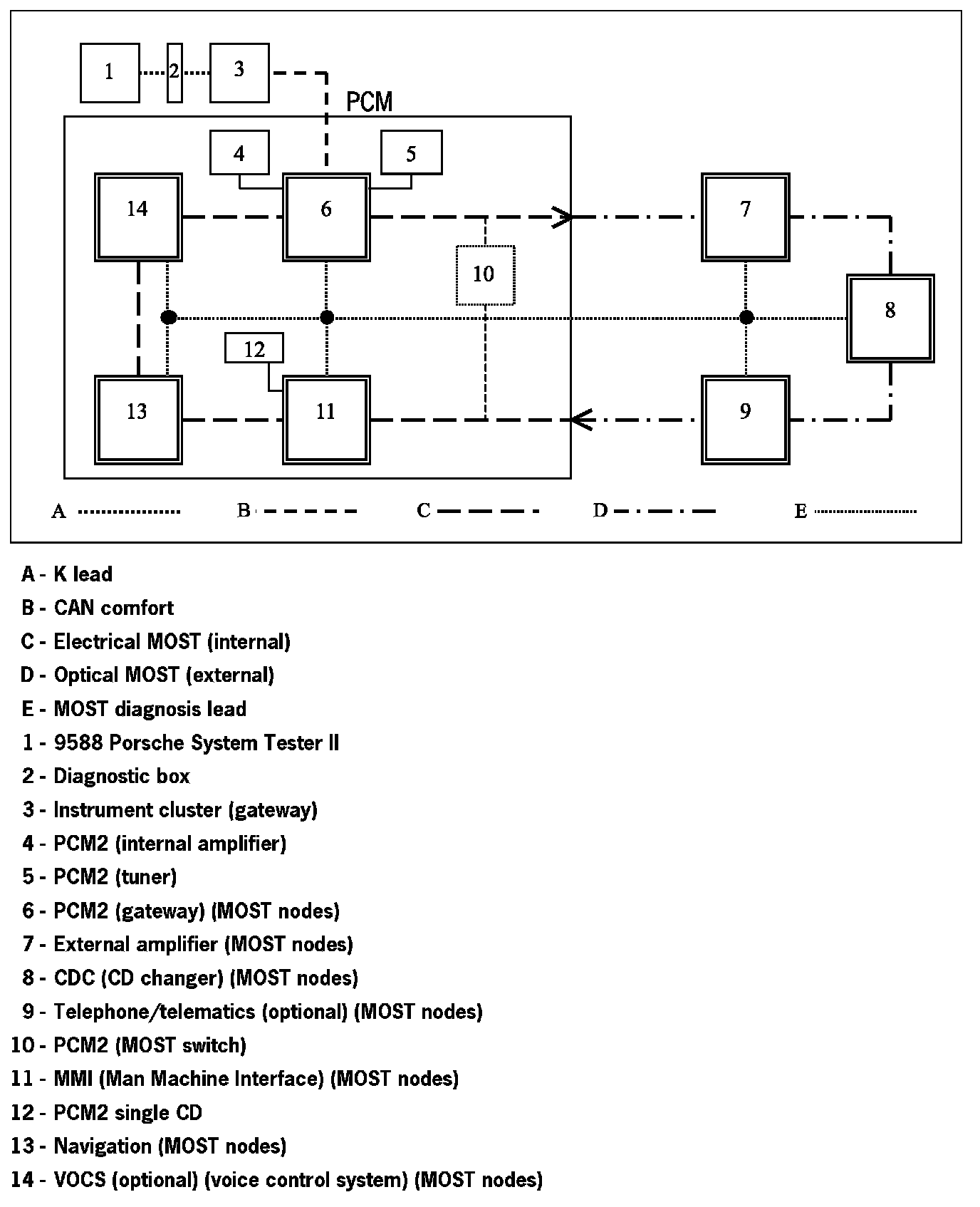 The PCM2 consists of at least two but a maximum of four MOST nodes, (Gateway, MMI and optional Navigation and VOCS (optional)), which communicate with each other via the electronic MOST. Data is transferred outside of the PCM2 via the optical MOST.