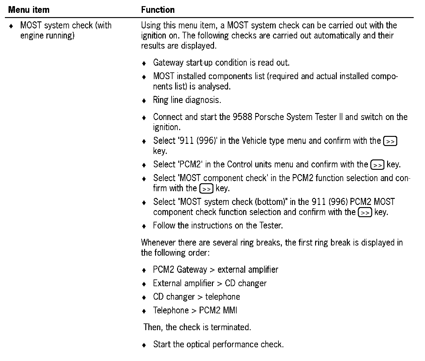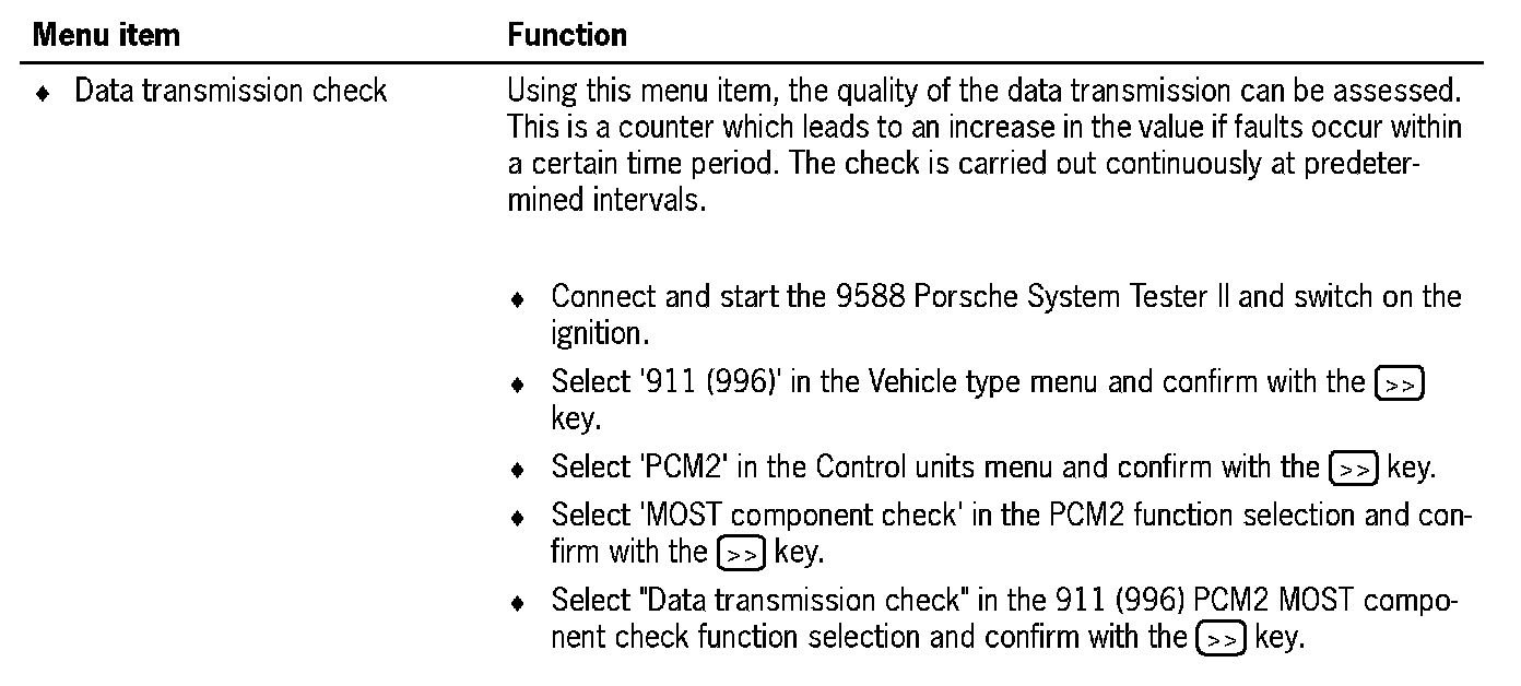 The MOST component check can be accessed via the PCM2 function selection menu. This comprises a summary of the following check processes: