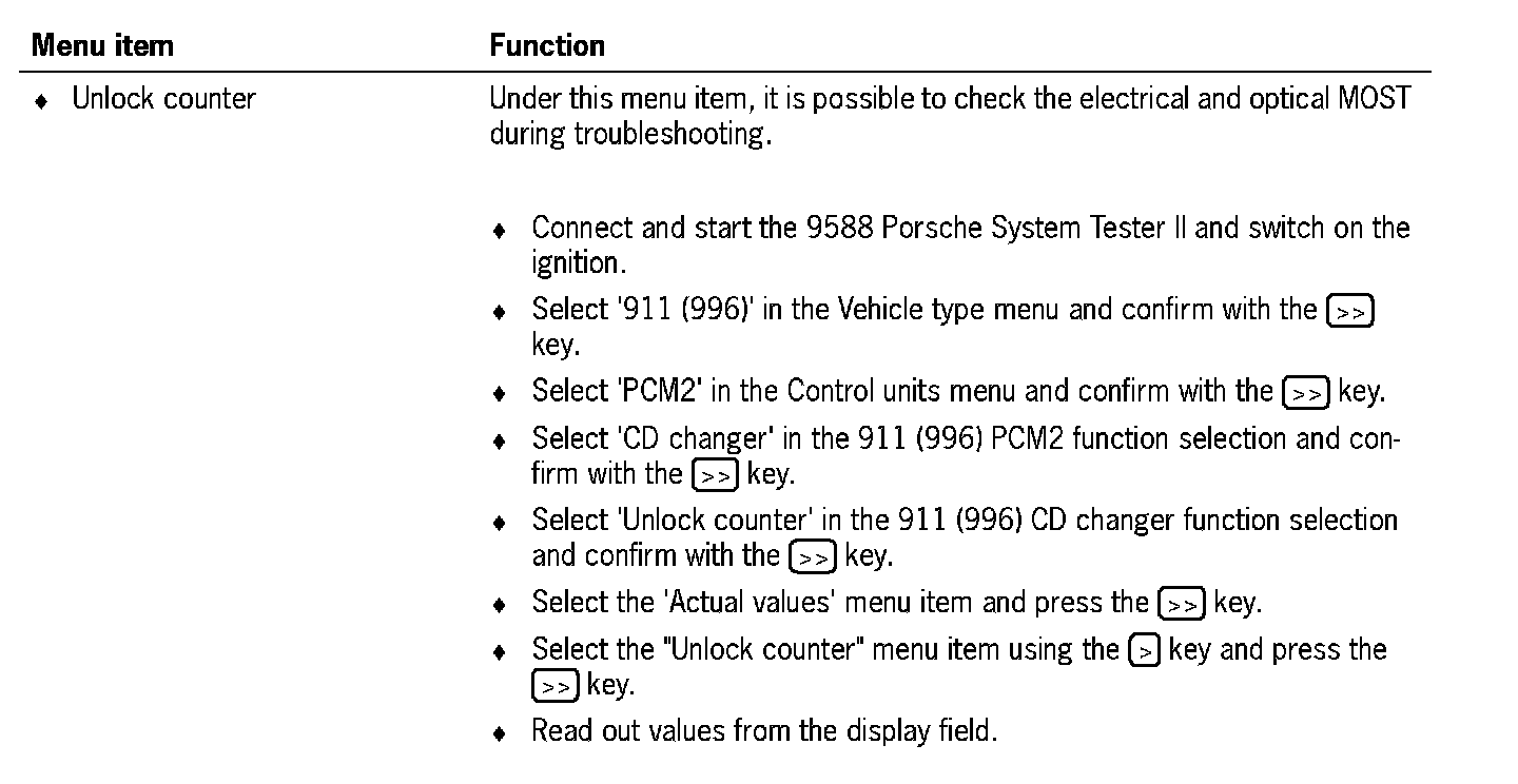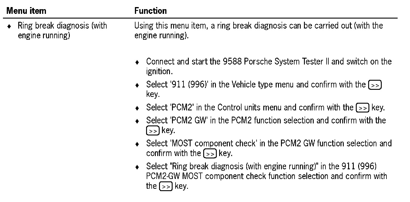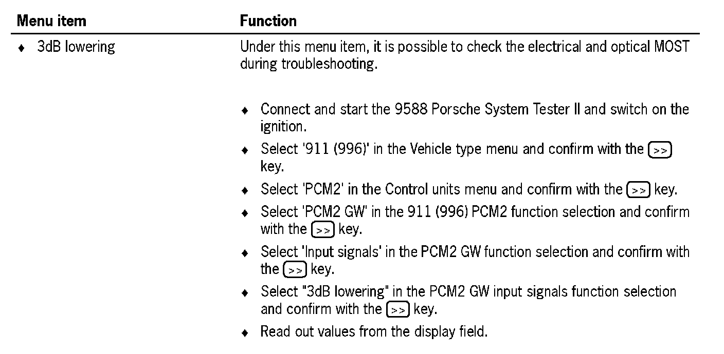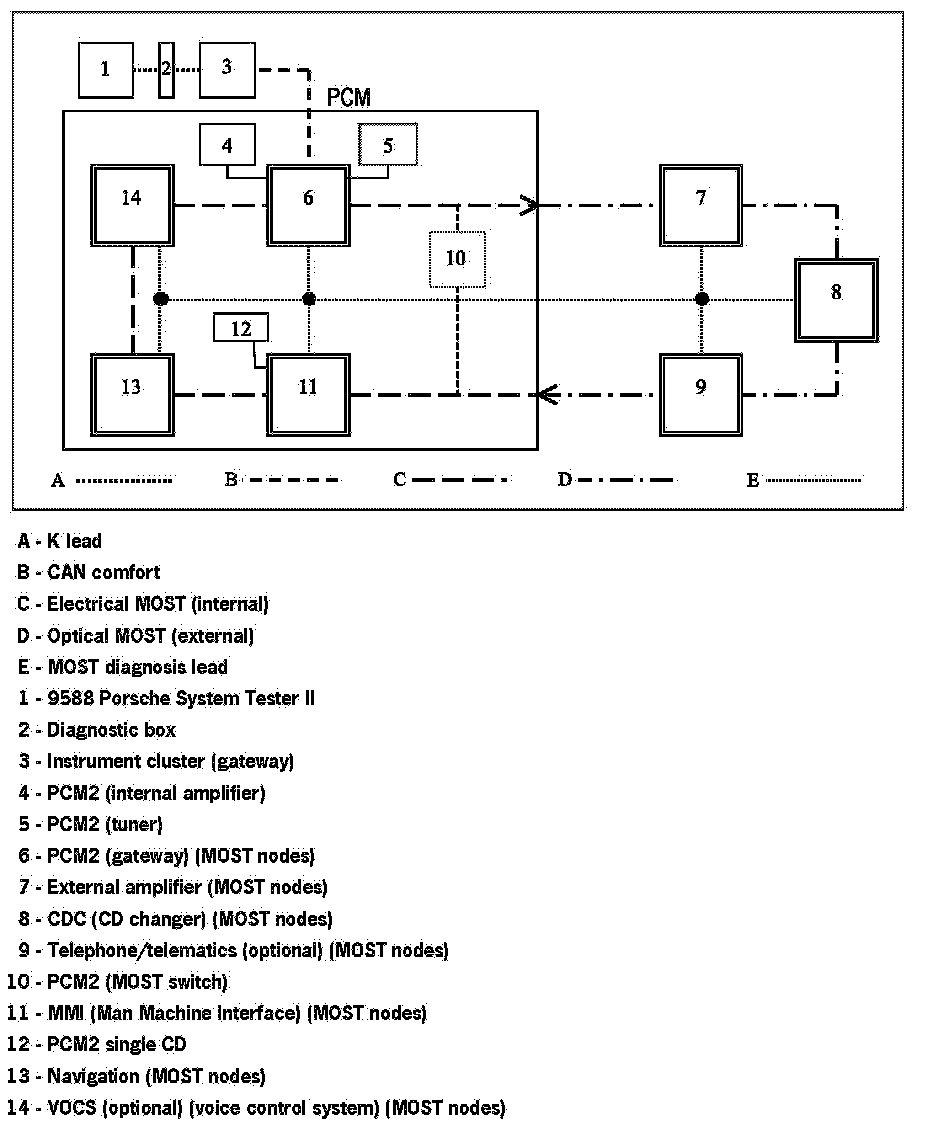 Communication between the 9588 Porsche System Tester II and the MOST control modules only takes place via the K lead to the instrument cluster. The data is transferred from the instrument cluster gateway to the MOST control modules, via CAN Comfort to the PCM2 gateway, via the electrical MOST in the PCM2 and via the optical MOST outside of the PCM2.