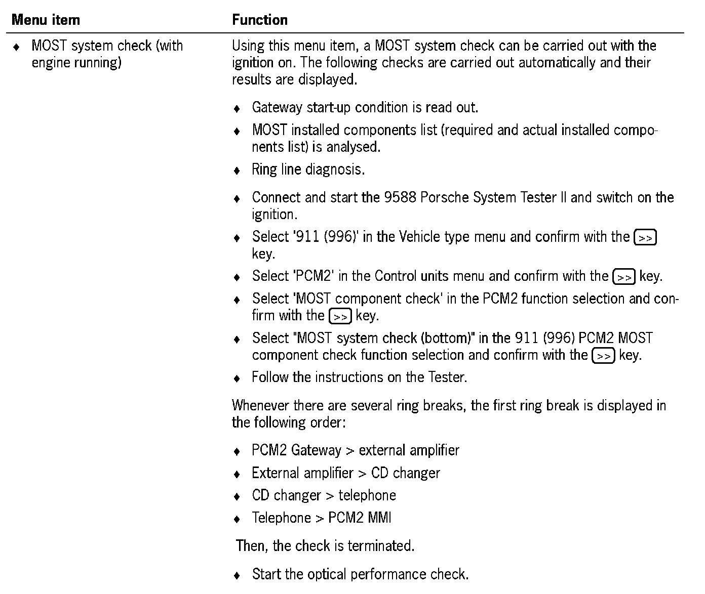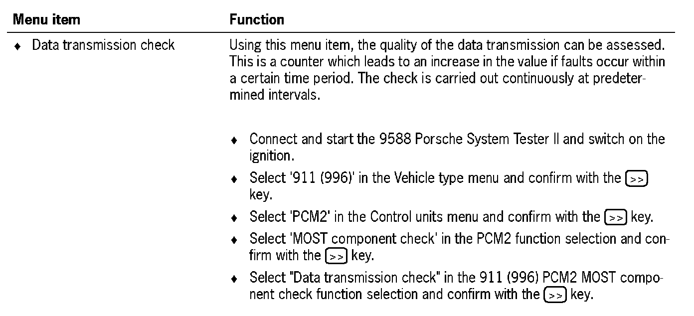 The MOST component check can be accessed via the PCM2 function selection menu. This comprises a summary of the following check processes: