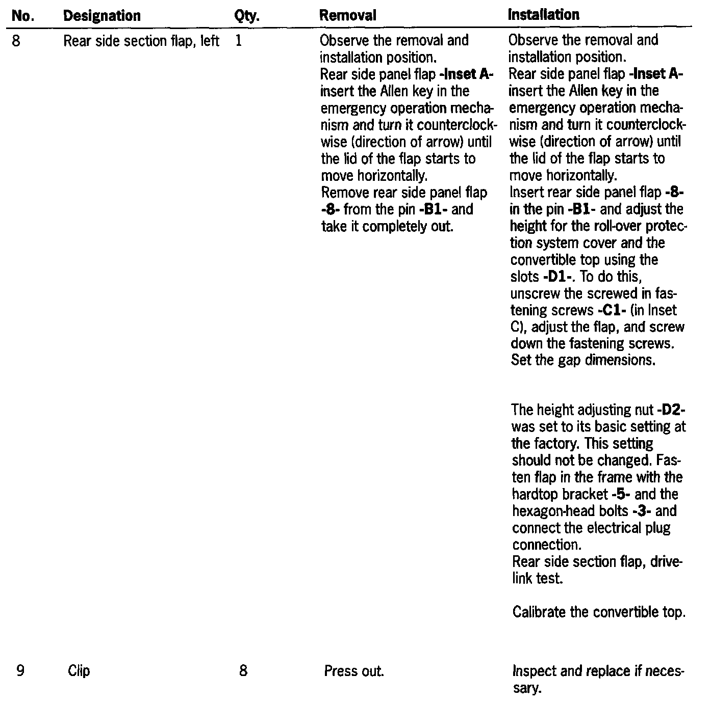 (Convertible top open and set down.) Insert a plastic spatula under the trim and press it out. The height adjustment is made using the Torx screws -D1- in the flap.