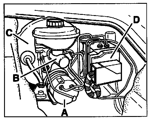 The booster pump -A- is located in front of the brake booster -C- in the 911 Carrera 4 and 911 Carrera 4S.