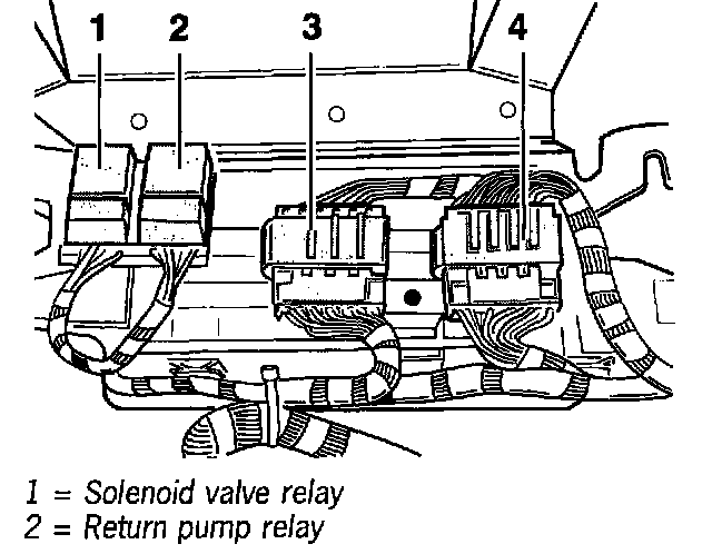 The pump relay and the solenoid valve relay are attached to a holder behind the PSM control module.