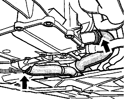 16. Pull the radiator supply and return lines off the engine. To do so, undo the screw-type hose clamps, carefully pull off the hoses and allow the remaining water to run out.