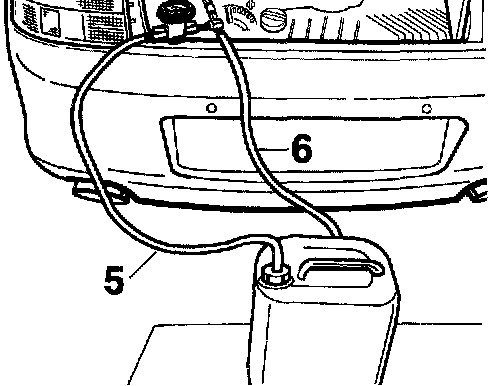 6. Connect the filler hose -(5)- of the vacuum pressure gauge at the canister connection; put the the return line -(6)- of the Venturi nozzle into a collecting container.