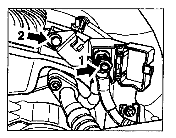 b. Disconnect battery positive lead -1- at B+ disconnection point. Unscrew the hexagon nut M8 and remove the positive lead. Then unscrew the hexagon-head bolt M6 x 12 -2- at the holder and lay the holder and box to one side.