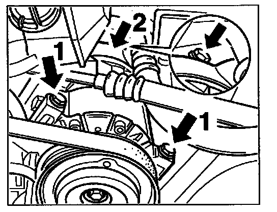 d. Remove the air-conditioning compressor. Tool recommendation: 1/4 inch -Figure d3-. 3 hexagon-head bolts M8: Unscrew 2 at rear -1-, 1 at front -2-. For better access to the front threaded part -2-, remove the engine compartment temperature sensor with the rubber sleeve at the right intake distributor. In order to lift the compressor out, pull the front fastening screw upwards out of the spacer sleeve. Disconnect the ground cable at the plug connection.