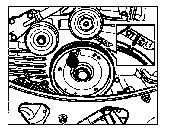 3. Turn the engine at the hexagon-head bolt (a/f 24) of the crankshaft belt pulley clockwise to TDC and then fix it with special tool fixing pins No. 9595/1 (use short fixing pin).