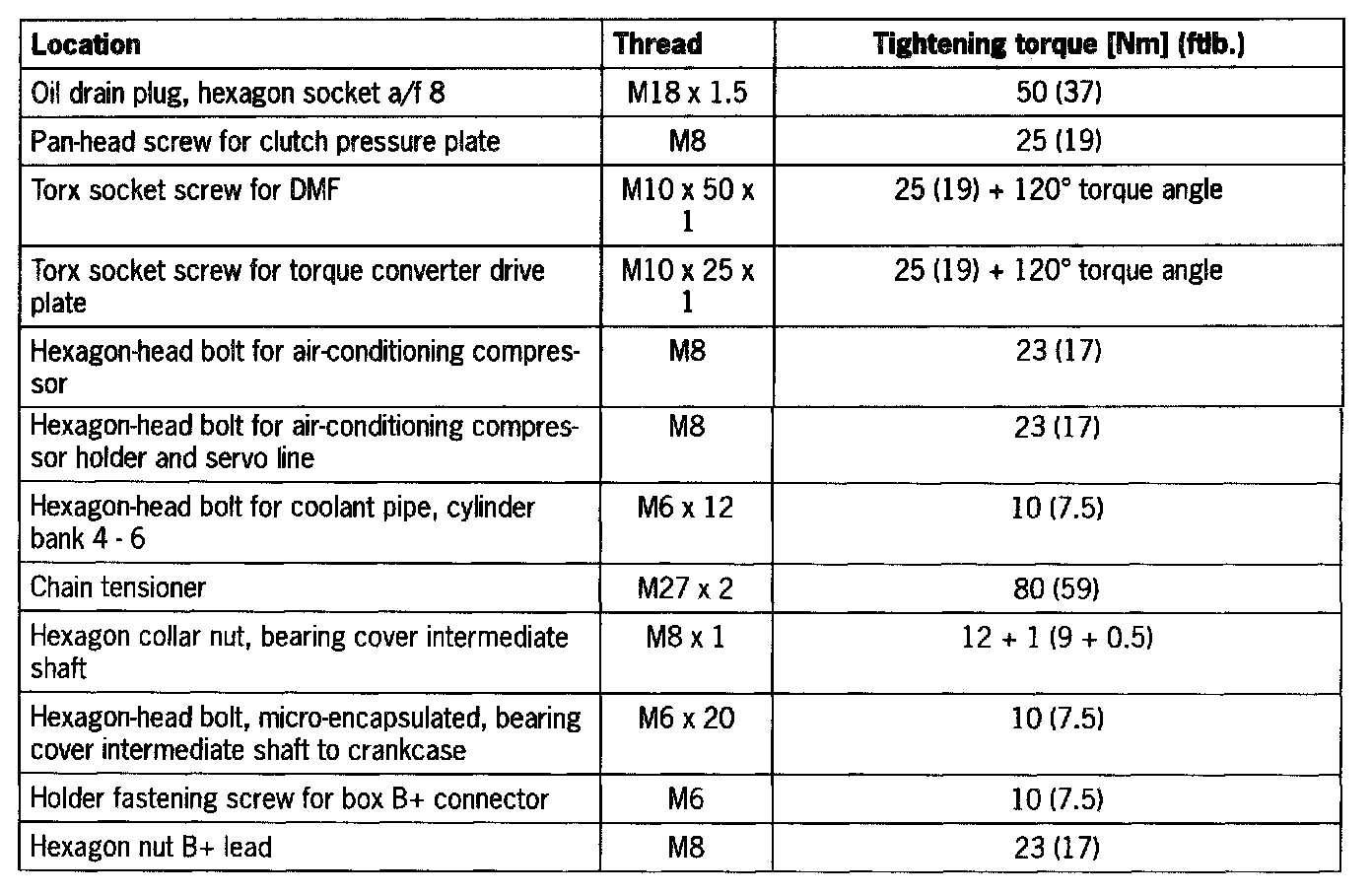 Tightening torque 25 Nm (19 ftlb.) + 120 degree torque angle