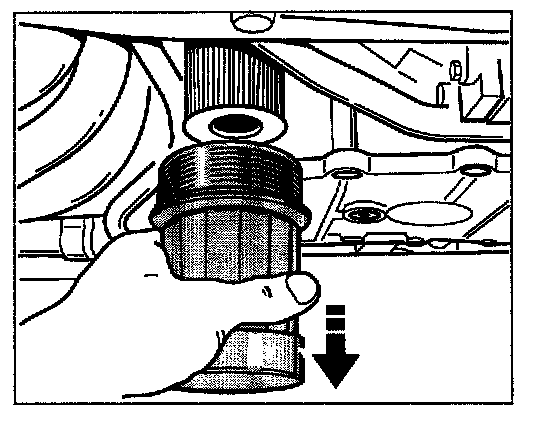 5. Remove oil filter housing vertically downward. Drain remaining oil into an oil collection container. Dispose of the waste oil in accordance with legal requirements.