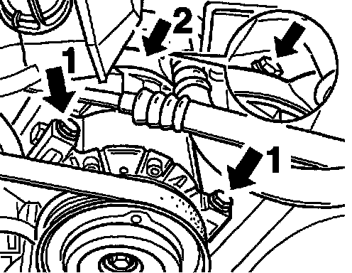 8. Place 3 M8 hexagon-head bolts onto the air conditioning compressor (2 short screws at rear -1-, 1 long screw at front -2- ) and tighten to tightening torque.